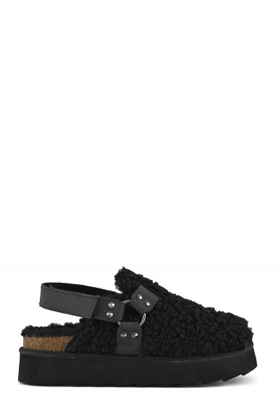 Platform sabot in teddy fur with leather straps