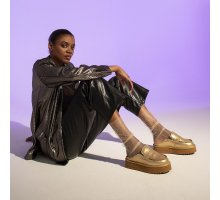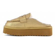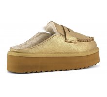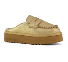 When the moccasin meets the sabot then the style is irresistibly unique and inimitable. This style entirely in suede with a metallic effect has a platform sole, a pretty tone-on-tone stitching on the upper and the interior entirely lined with soft eco-fur. Ideal for those who do not want to give up a more preppy look even on cold winter days, it can enhance any look, even for the most elegant evening occasions.