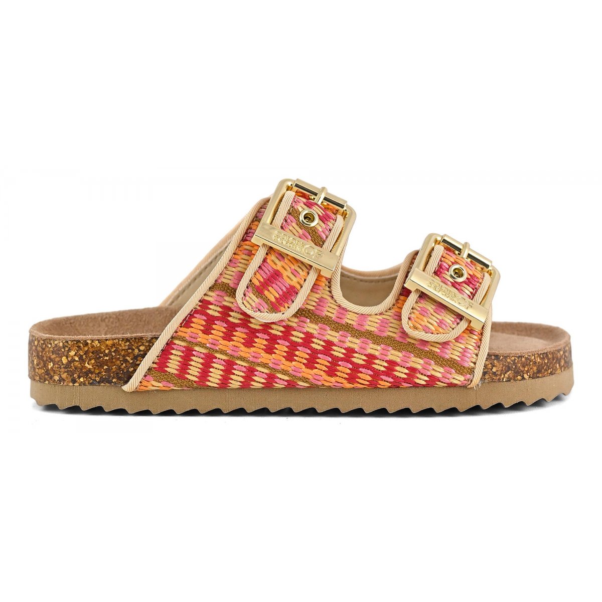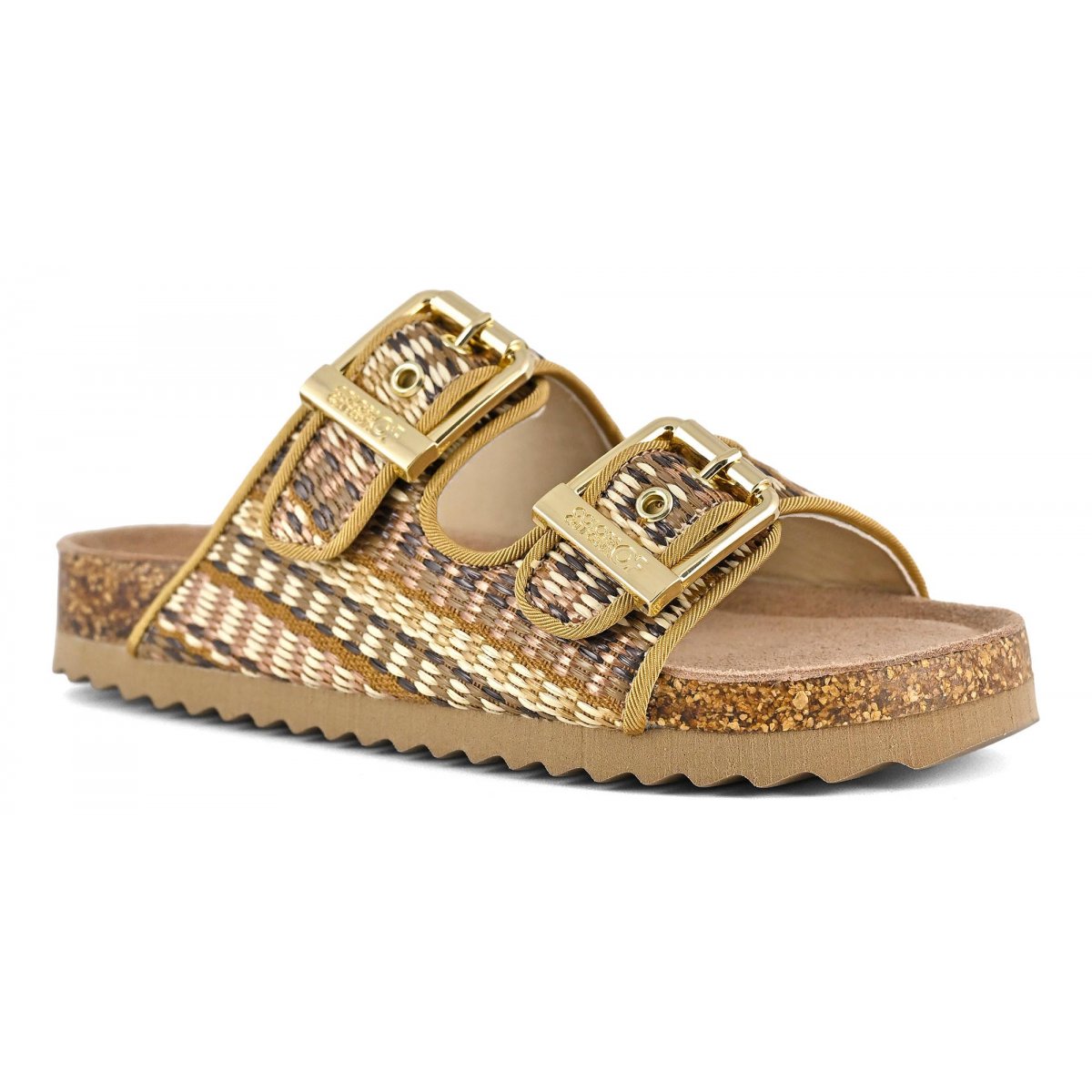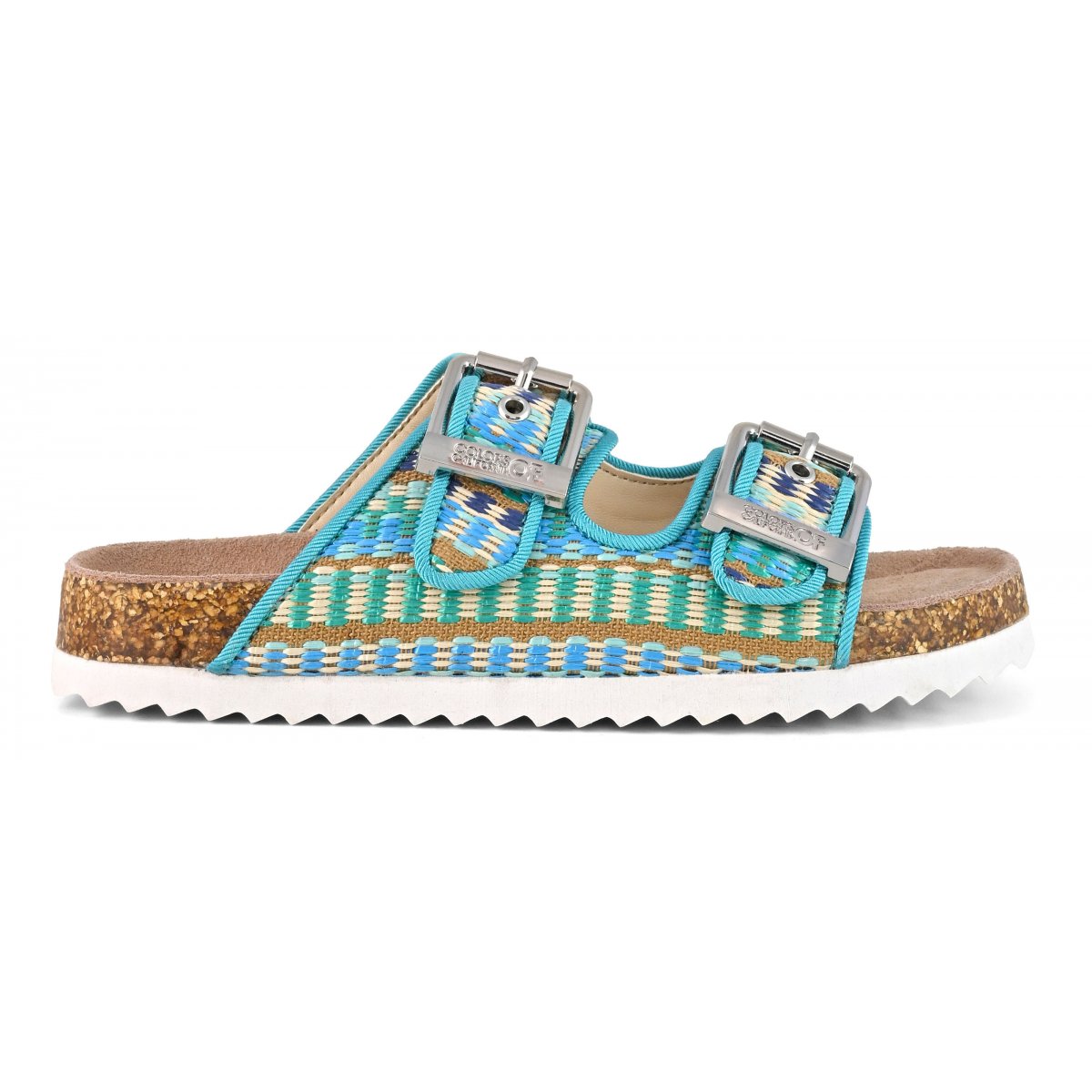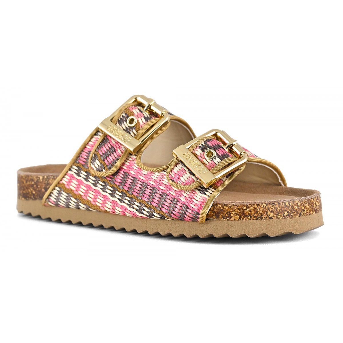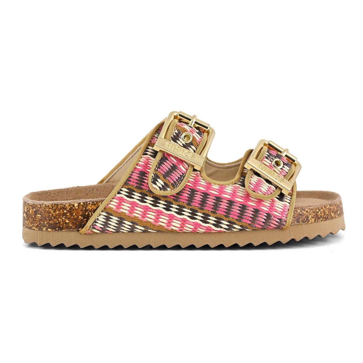 This two-band sandal has a suede insole and the upper is entirely in raffia. The two branded metal buckles create a fun, bright contrast. The perfect style for mini me's perfectly matched to their moms with a super summery style that oozes ethno-chic flavor. Perfect with total white, fresh and light outfits.