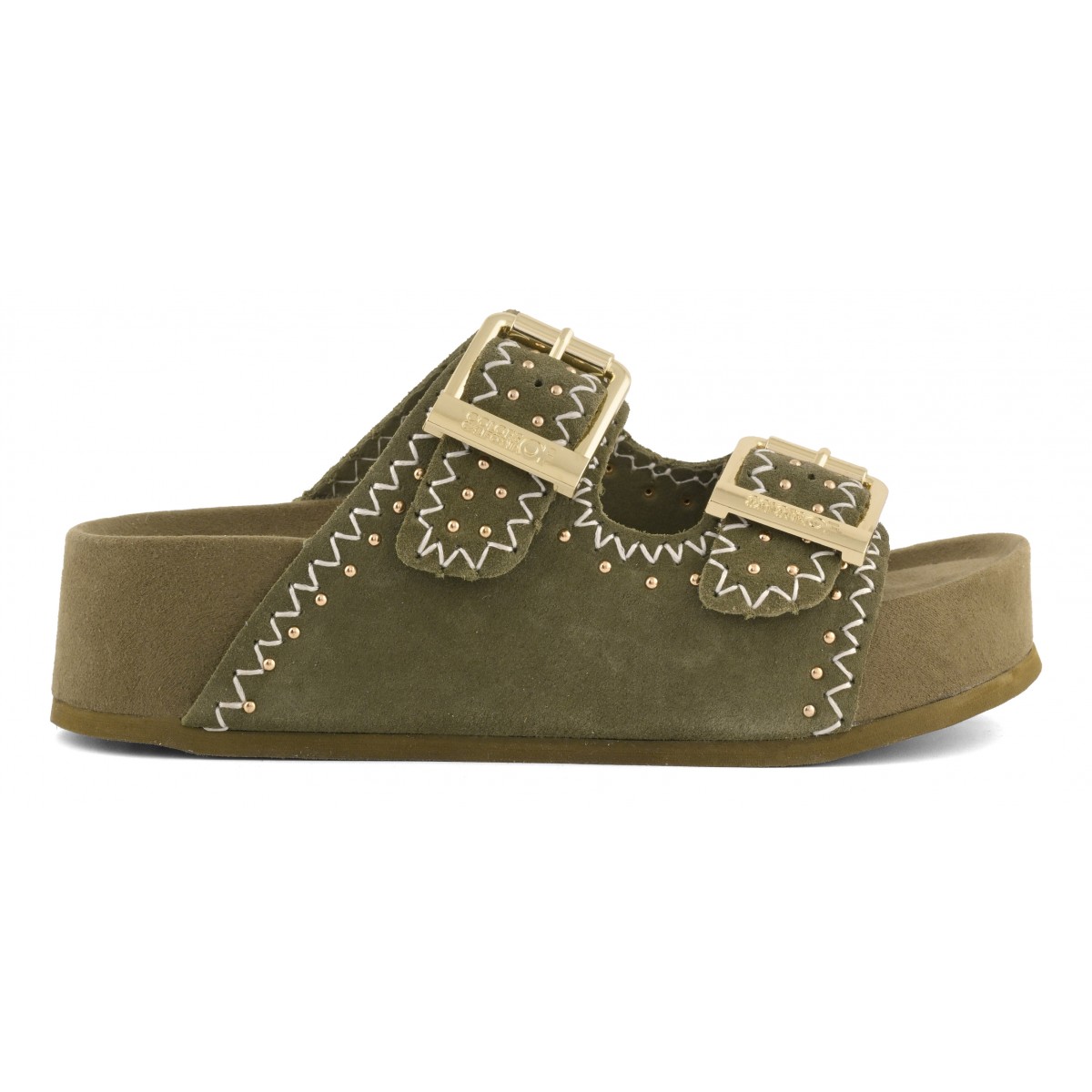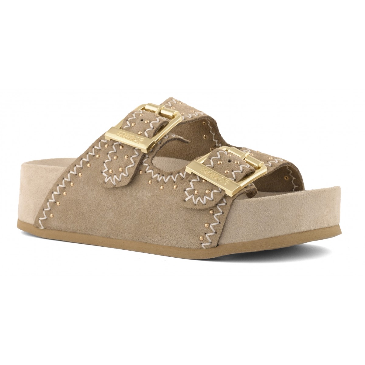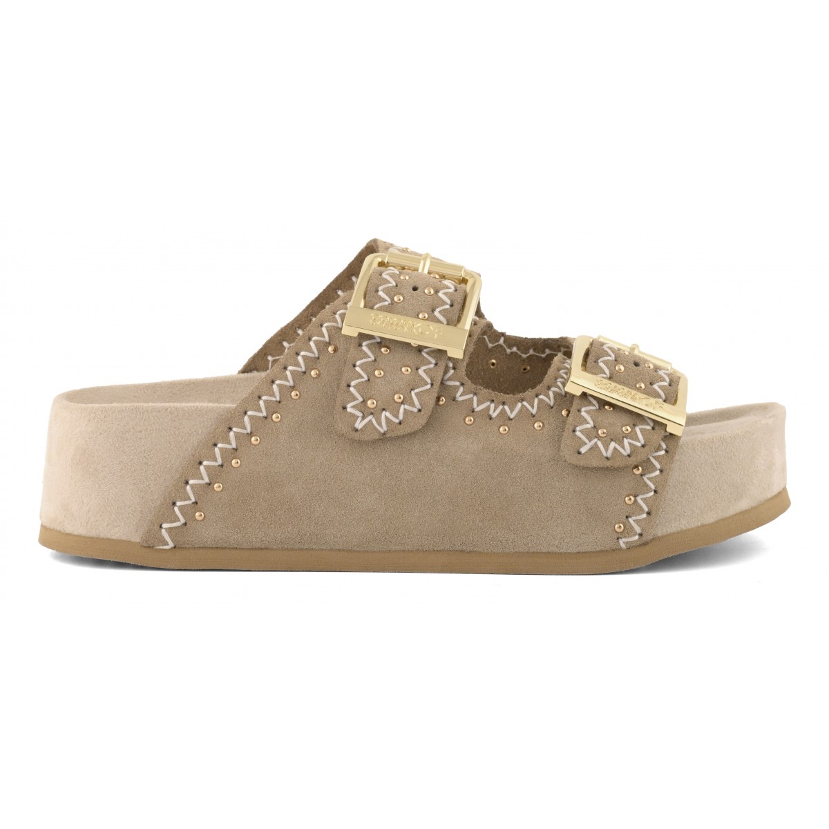 Un sandalo platform dal carattere essenziale e sofisticato, ispirato all’estetica boho-chic. La tomaia in pelle scamosciata, vellutata al tatto, è scandita dal dettaglio delle cuciture decorative, un tocco di stile unico. Le doppie fasce con fibbie regolabili garantiscono una calzata personalizzata mentre la suola alta e morbida conferisce stabilità e comfort. Un sandalo essenziale ma ricco di personalità, un valido alleato di stile, dal caftano in spiaggia al completo di lino in città.