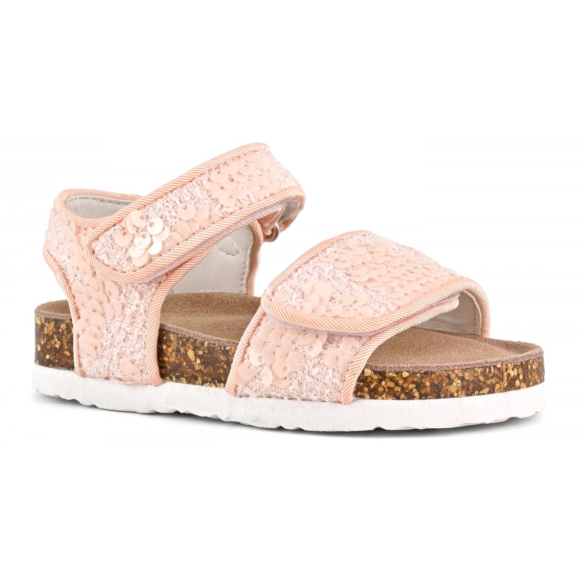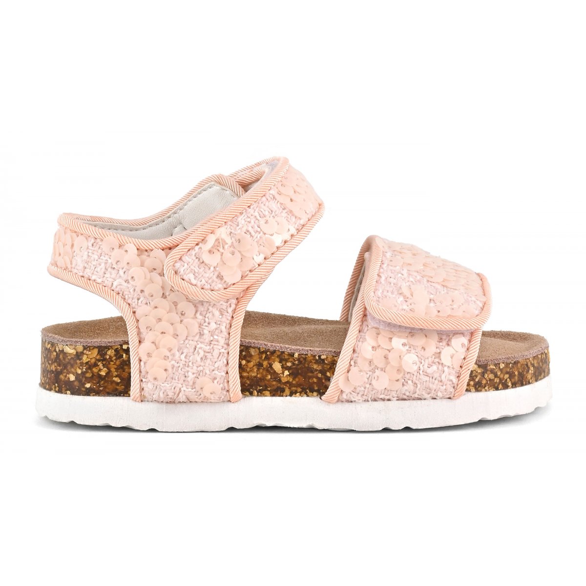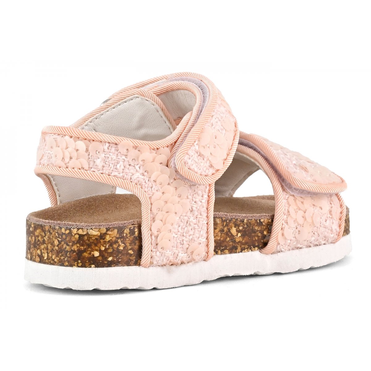 Questo sfizioso sandalo ha una fascia con chiusura in velcro, pratica e veloce da indossare. Il soletto è in pelle scamosciata e il morbido tessuto della tomaia è impreziosito da mini paillettes che rendono questo modello leggero e molto stiloso. Romantico e molto chic, saprà dare un tocco di classe alle bimbe più sbarazzine, sia su look eleganti che su quelli più casual.
