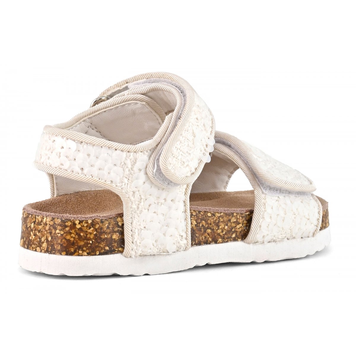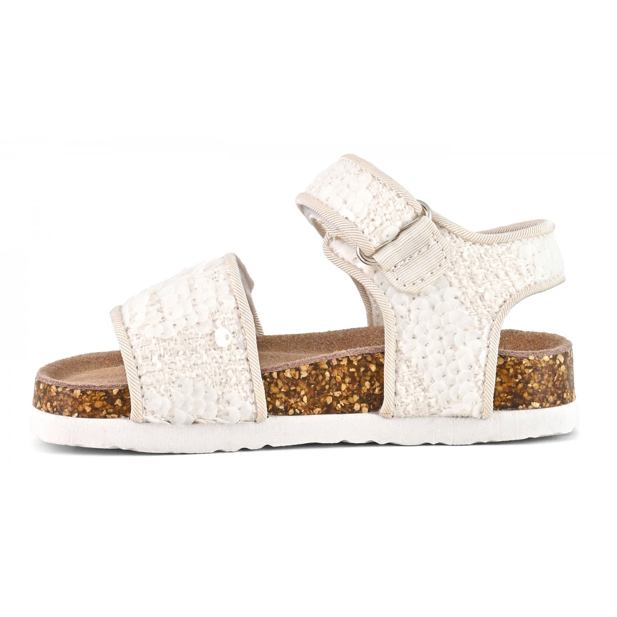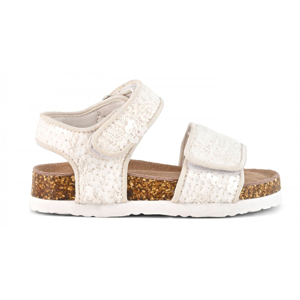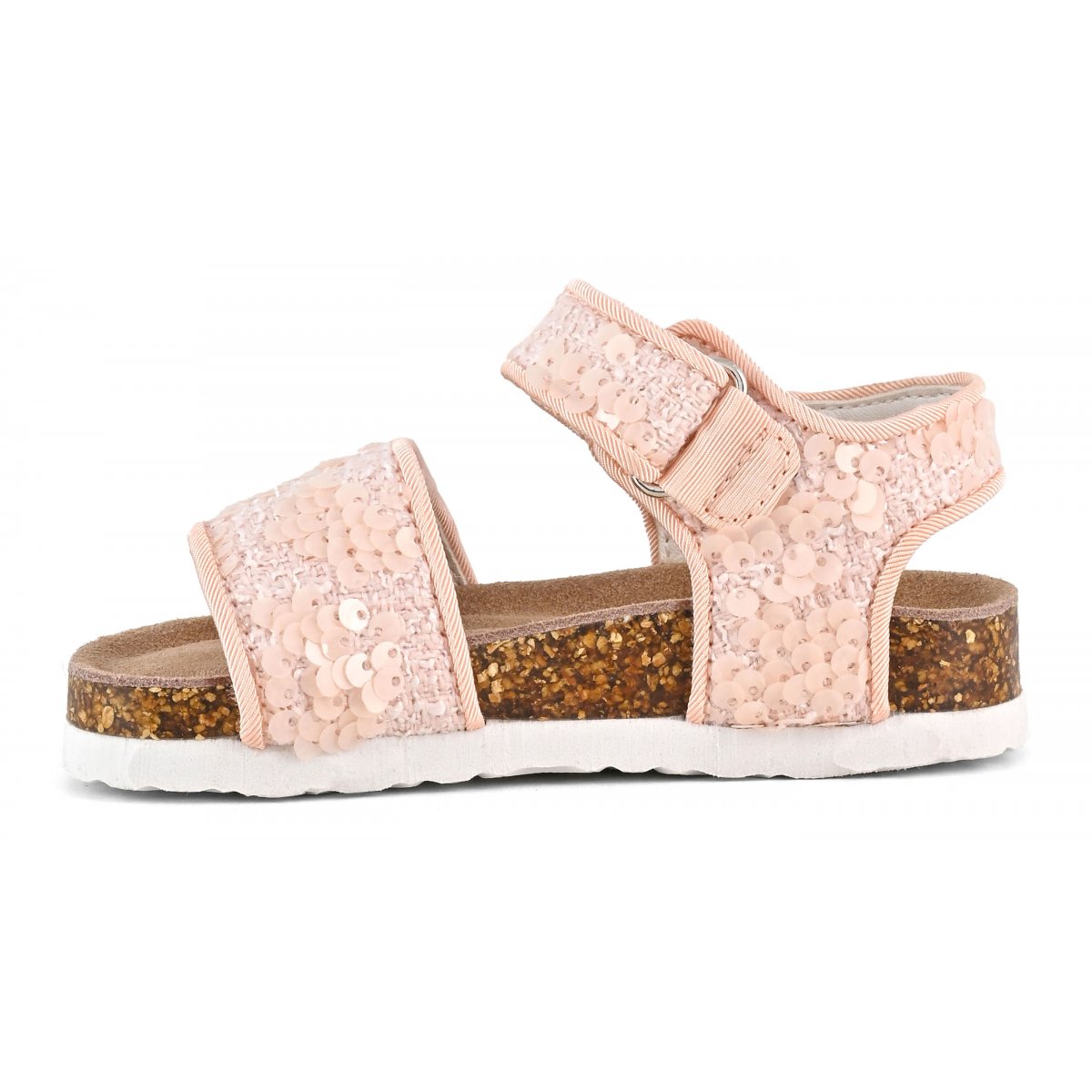 Questo sfizioso sandalo ha una fascia con chiusura in velcro, pratica e veloce da indossare. Il soletto è in pelle scamosciata e il morbido tessuto della tomaia è impreziosito da mini paillettes che rendono questo modello leggero e molto stiloso. Romantico e molto chic, saprà dare un tocco di classe alle bimbe più sbarazzine, sia su look eleganti che su quelli più casual.